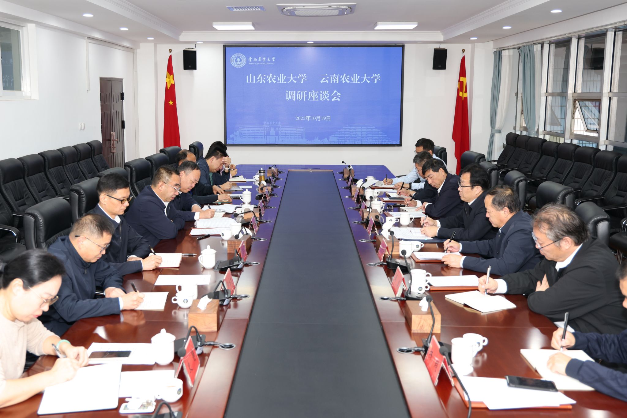 本站消息 10月19日,山东农业大学党委书记徐剑波、党委副书记嵇景涛一行来校交流座谈,围绕人才队伍建设、科技创新及“十五五”发展规划等领域深入交流。学校党委书记王卫斌、党委副书记黄鹤平出席座谈会,两校相...