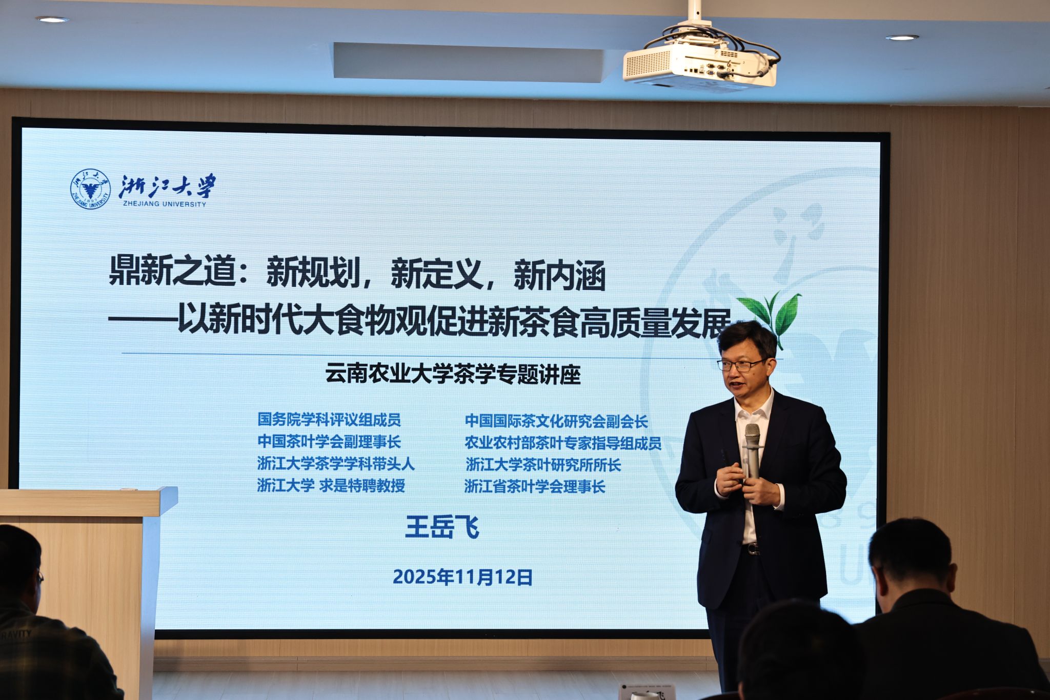 本站消息 11月12日上午,“红土地大讲堂”系列学术讲座在养正楼B302茶学院茶艺大厅隆重开讲。本次讲座由学校主办,茶学院与科技处联合承办,特别邀请到国务院学科评议组专家、浙江大学茶学学科带头人、“求是特聘”学者王岳飞教授担任主讲嘉宾。校长李永和教授出席活动。报告以《鼎新之道:新规划、新定义、新内涵—以新时代大食物观促进新茶食高质量发展》为题,阐释了茶作为中华文化重要载体,穿越历史、跨越国界的独特价值。王岳飞教授系统梳理了中国茶产业“...